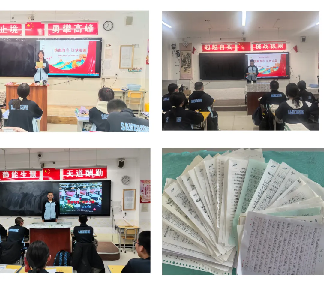 与此同时,全校其他班级同步开展”热血青春,筑梦边疆”主题班会。各班通过观看边防纪实影片、分享戍边英雄事迹,感悟”边关冷月照铁衣”的坚守精神。活动中,学生们提笔写下《致边防战士的一封信》,字句铿锵:”你们是界碑,我们是未来!愿以知识为盾,以理想为矛,共筑祖国山河无恙。”书信满载敬意与承诺,将由学校统一寄往边疆哨所。