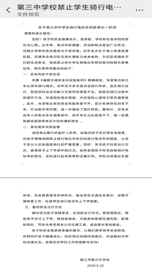 我校已于2025年5月23日向全体家长发放了《关于禁止学生骑行电动车的告知书》,详细阐述了禁止学生骑行电动车的政策依据、安全隐患及注意事项,明确要求家长切实履行好监护人职责,加强对子女的日常监管,严禁学生骑行电动车上下学。各位家长需认真阅读告知书内容,充分认识此项工作的重要性,积极配合学校做好相关教育管理工作。